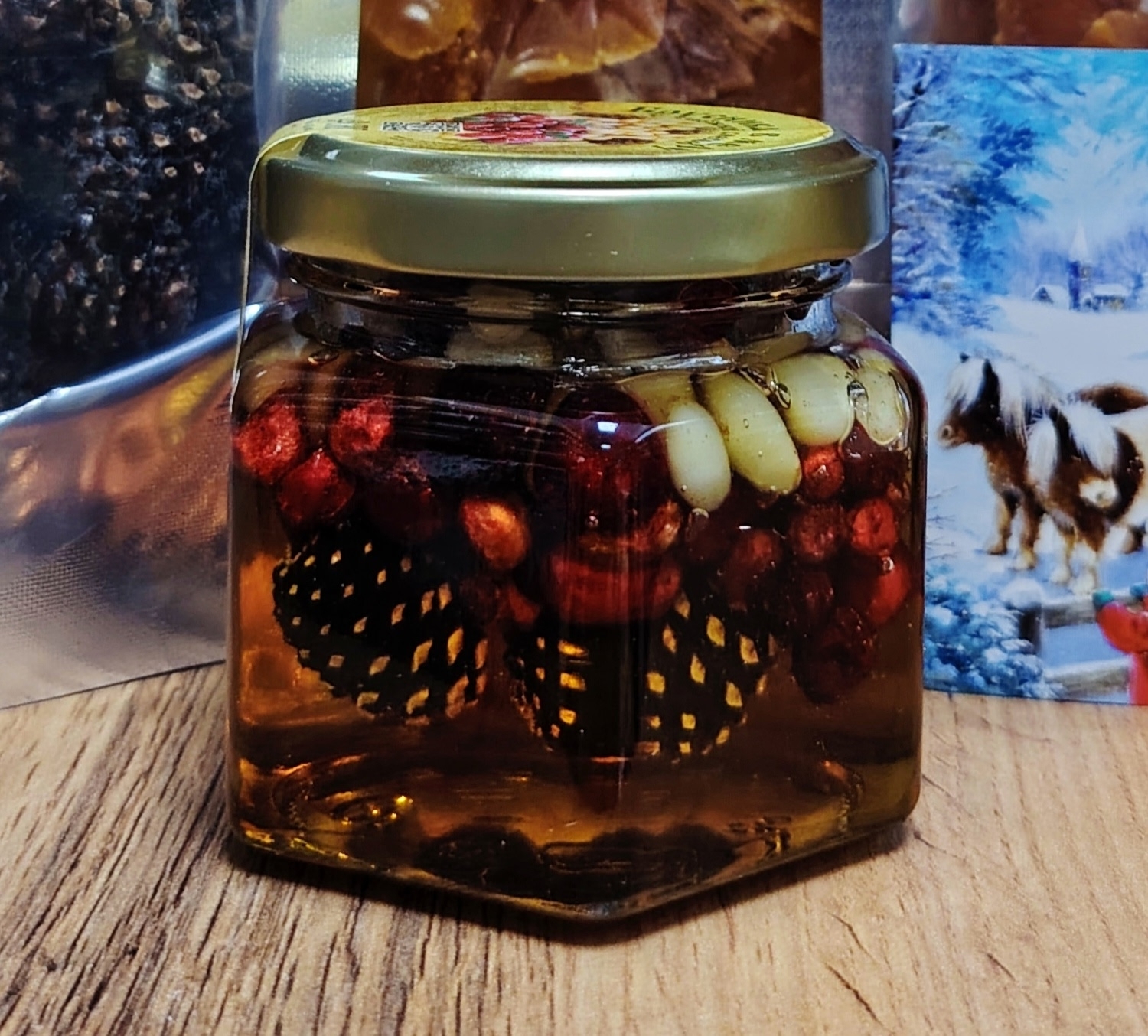 • Натуральные ингредиенты: Микс состоит из отборных кедровых орешков, вяленых сосновых шишек и брусники, залитых 100% натуральным луговым медом без добавок и усилителей вкуса.