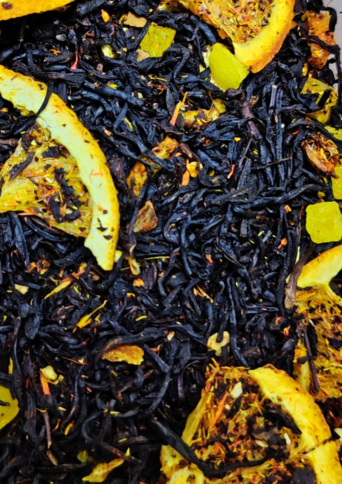 Индийский черный чай, Кенийский черный чай, апельсин, корица дробленая, корка апельсина, облепиха, сафлор, сублимированная облепиха, цукаты папайи