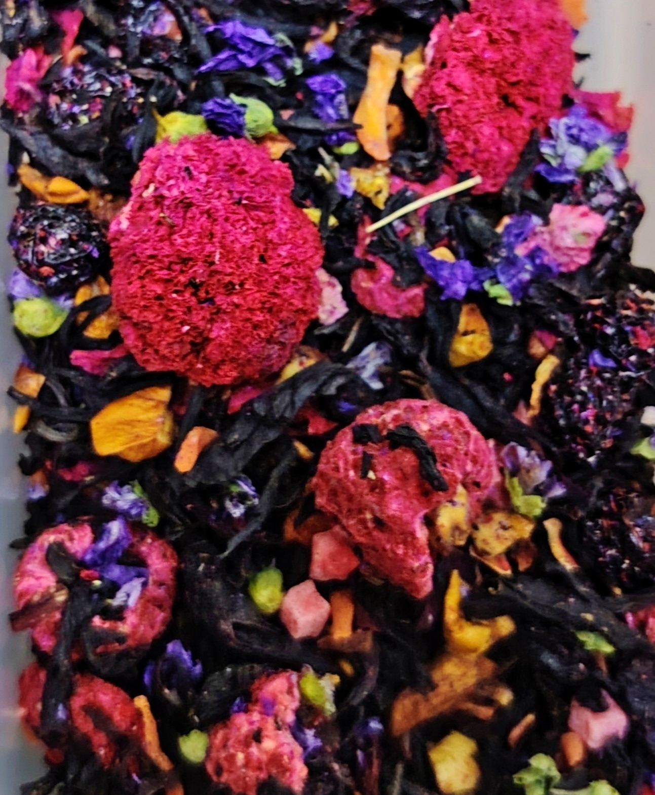 Индийский черный чай, боярышник черный, вишня сушеная, каркаде резанный, косточка шиповника, малина сублимированная, мальва, морковь цукаты, цветок граната, цукаты папайи, яблоко резанное.
