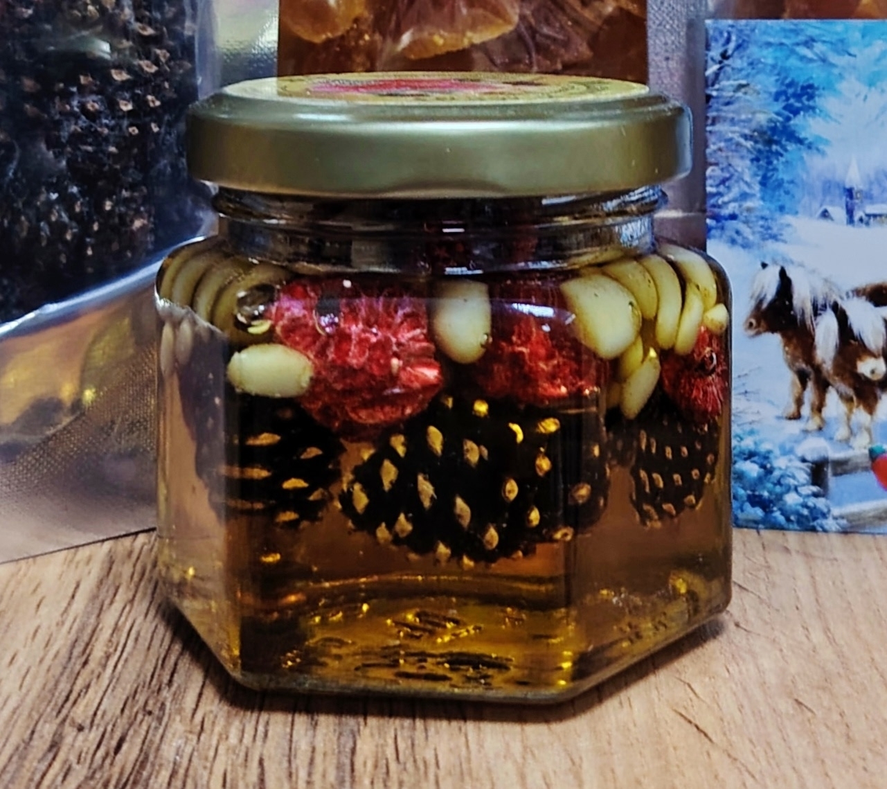 • Натуральные ингредиенты: Микс состоит из отборных кедровых орешков, вяленых сосновых шишек и малины, залитых 100% натуральным луговым медом без добавок и усилителей вкуса.